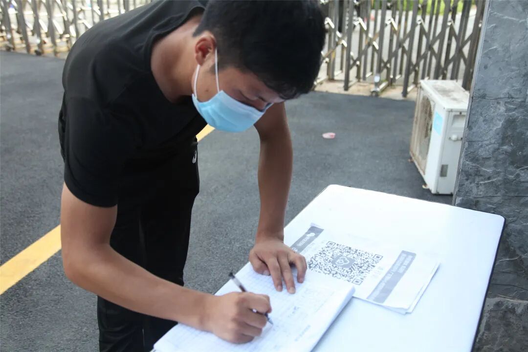 严格落实进营地戴口罩、测温、验码、登记工作。报到时学员携带学习和生活等必备用品,经过消毒喷洒处理;学员依次排队,双手经过消毒,每位学员保持一米的间隔,依次进行体温检测。测量体温正常之后,出示“健康二维码”,才能进入营区。