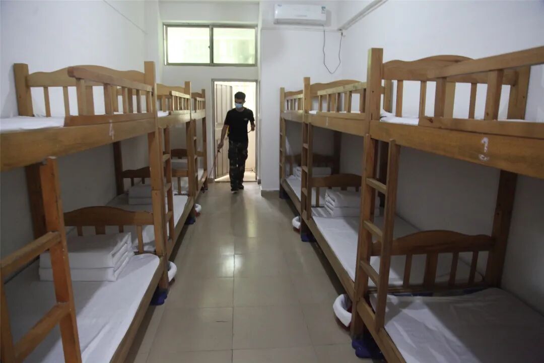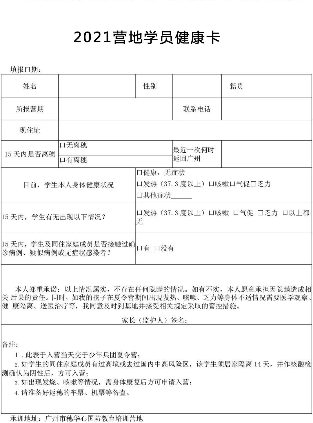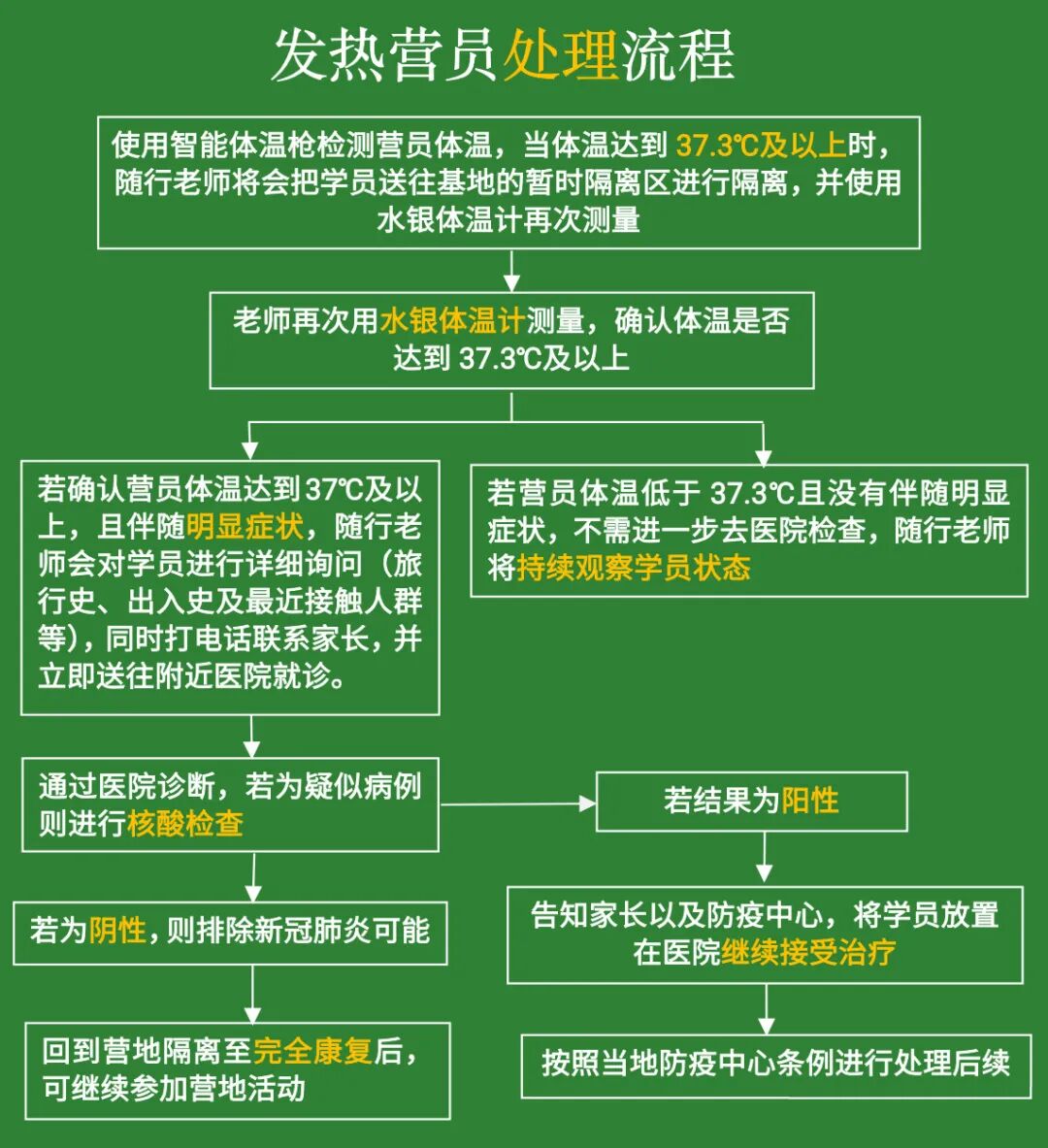 进入营地,学员提交“学员承诺书”和“单位承诺书”, 并领取营区出入证与体温检测记录表等。同时,还要做好学员和员工的健康排查。对从疫情中风险地区往返人员、有发热症状人员实施临时隔离14天,并联系进行核酸检测,切实掌握入营人员的健康状况和行程动向,了解其外出史、接触史、疾病史等关键信息,做到摸清底子、明确实情。同时设置临时隔离室、防疫物资储备室,备足口罩、消毒液等防疫物资,满足开营后的正常供应。