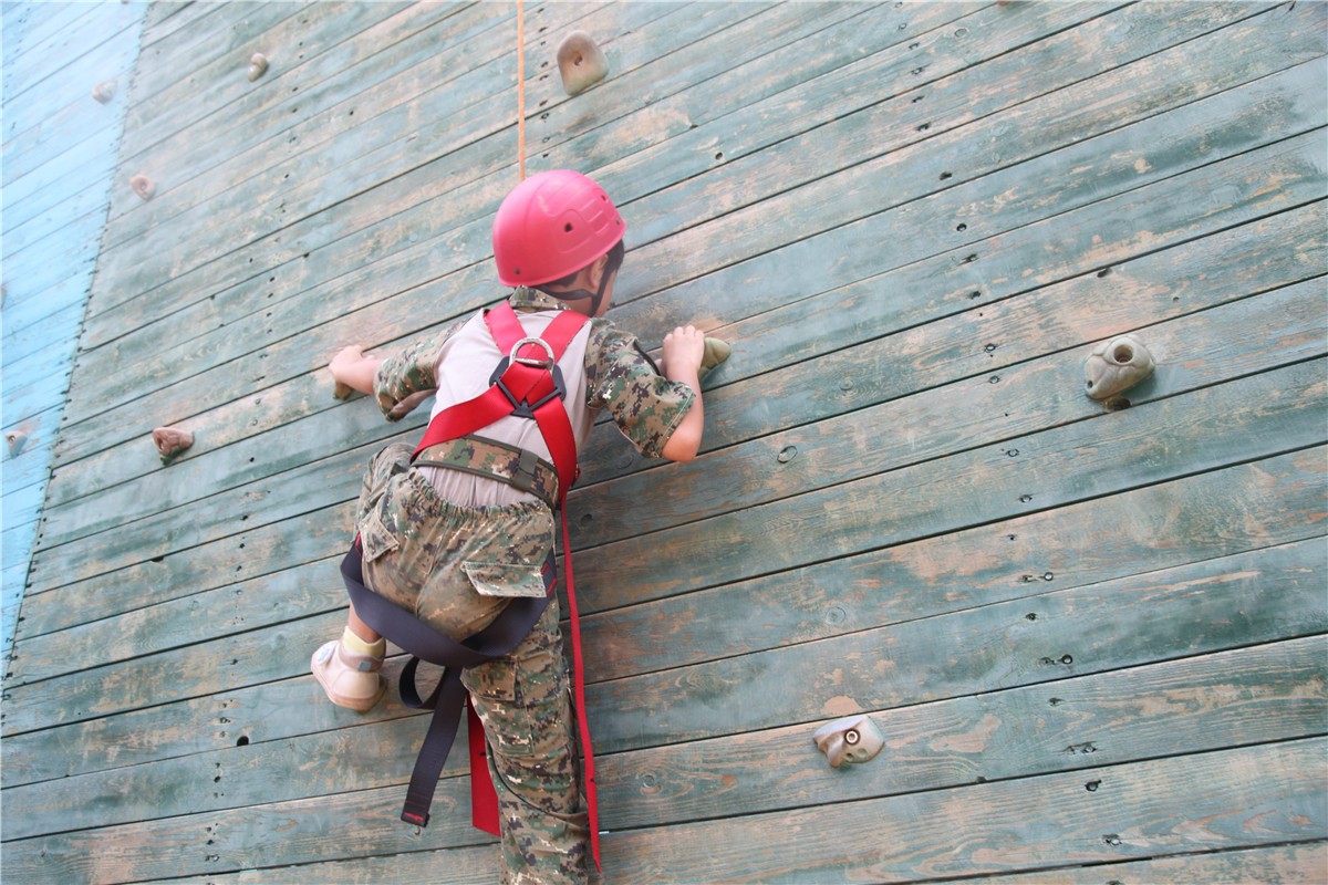 在高空拓展训练场,穗华心少年兵团夏令营正在组织营员开展高空训练。今年十岁的孟繁熙,在教官的鼓励下,顺利完成了挑战。他说,上去之前还挺怕的,等我站在上面的时候,就没那么怕了,谢谢教官!